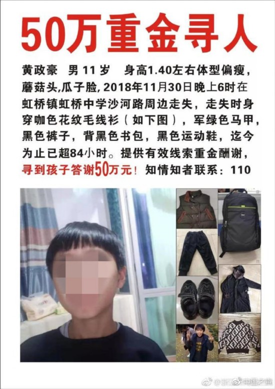 据中国之声《新闻纵横》报道:浙江乐清市公安发布的一条“紧急寻人”微博,最近在网上引发大量关注。乐清警方接到一名11岁男孩的母亲报警称,孩子于11月30日下午在放学回家途中失联。接报后,警方连夜开展寻人工作,与此同时,寻人的消息在各大社交平台也被大量接力转发,孩子的父亲更是发布消息表示愿意“重金寻子”,孩子的下落牵动人心。