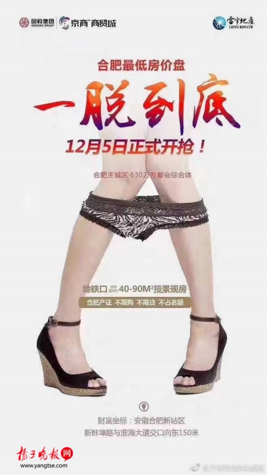 从网上传播的广告上来看,这家楼盘位于合肥市新站区,销售40至90平米揽景现房,“12月5日正式开抢“。整个画面中央是一名女性裸露的双腿,内裤在膝盖以下位置,广告词称:“合肥最低房价盘 一脱到底。”其中“一脱到底“四个字字号极大,异常显眼,广告顶部标有国购集团、京商商贸城、雷宇地产的字样。