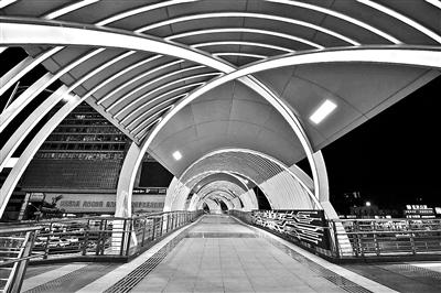 昨天傍晚,北京青年报记者穿过北四环,由北向南进入中关村大街,经过的第一座过街天桥就是海龙科贸过街天桥,桥上亮起双螺旋造型灯光,在夜空中格外绚丽。这座过街天桥长约122米,宽约9米,于2008年建成开通,今年6月开始改造施工。