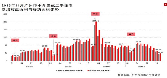 另据广州市房地产中介协会日前公布的数据,2018年11月广州全市中介促成的二手住宅签约量刷新近33个月以来(自2016年3月起计算)的最低记录,原因主要是11月1日新网签系统上线运行,中介机构还没有适应新规则。