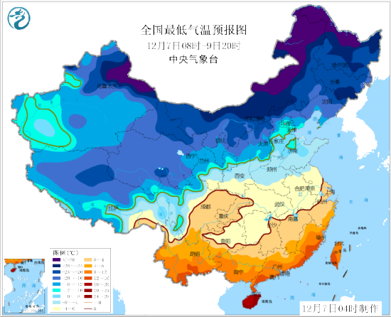 中新网12月7日电 据中央气象台网站,中央气象台12月7日06时继续发布寒潮蓝色预警:受强冷空气影响,预计7日至9日,江南、华南、贵州南部等地的部分地区先后有4~5级偏北风,气温随之下降6~8℃,其中,福建中南部、广东南部及广西南部等地的部分地区气温下降8~10℃。东部和南部海区先后有7~8级、阵风9~10级大风。9日早间最低气温0℃线将南压至江南北部至贵州中部一带。