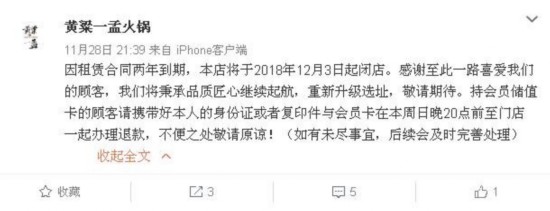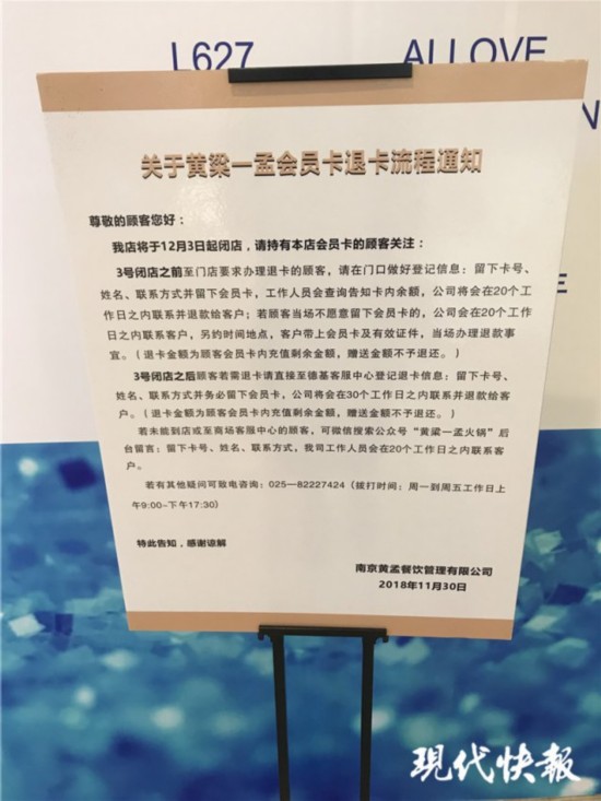 虽然价格接地气了,"黄粱一孟"还是以闭店收场。官方说法是,因租赁合同两年到期,于 2018 年 12 月 3 日起闭店。12 月 6 日,现代快报记者来到了位于德基广场一期 6 楼的"黄粱一孟"火锅店,发现店铺已经被挡板全部围挡起来,门口的通知上公布了会员卡退卡退金额的详细流程步骤。