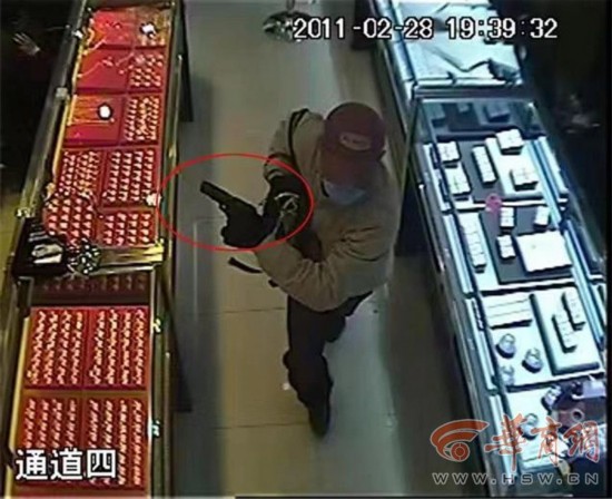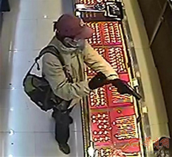 2011年2月28日晚7时许,一名身高1.7米左右、体态偏瘦、戴着口罩和手套、携有深色双肩包的男子,走进位于西安市电子正街的“老凤祥”金店,掏出随身携带的手枪,击破柜台玻璃,抢走大量黄金首饰后夺路逃窜,被抢金饰品价值14万余元。