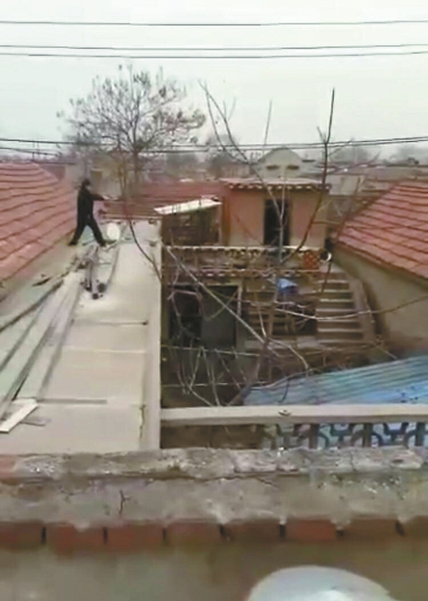 村民当即报警,民警迅速赶到现场。据目击村民拍摄的视频显示,事发村民家院里有一狭窄的楼梯通向房顶,在房顶的平台设有狗笼。民警站在比房顶更高的一处平台上,持枪向院里接连开了两枪。“当时应该连开了好几枪,才把两条狗给打死了。”