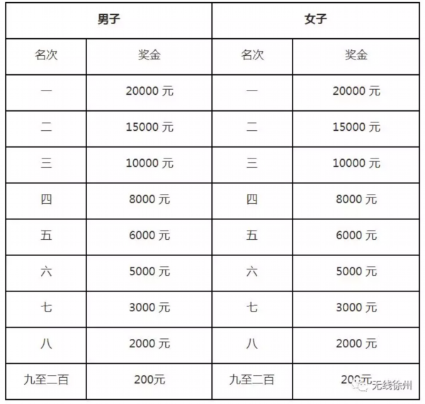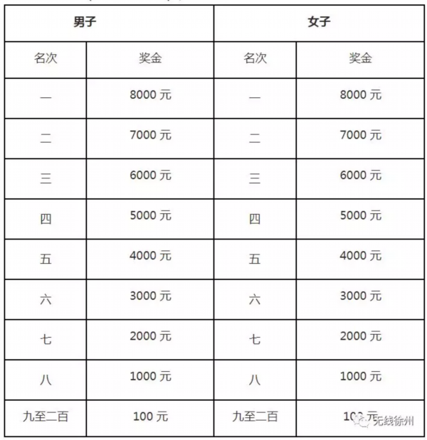 1、总成绩男、女前八名的选手(按枪声成绩),分别获得奖金;总成绩男、女第九名到第二百名选手(按净计时成绩),分别获得奖金。