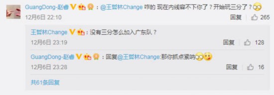 面对赵睿的“挑衅”王哲林风趣的回道道:“没有三分怎么加入广东队?”随后赵睿也开玩笑表示:“那你抓点紧呐!”