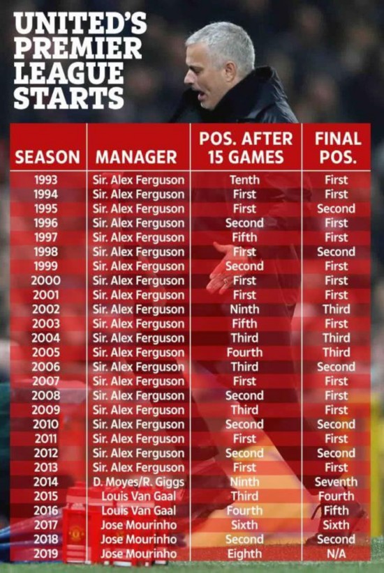1992-93赛季,弗格森的曼联在15轮过后排名联赛第10位,但是奇迹是,在赛季结束的时候,曼联拿到了联赛冠军,不过当时英超的单赛季有42轮。2001-02赛季,弗格森的曼联在15轮过后也有排名第9位的情况,但是最终,他们拿到了联赛第三名。在2013-14赛季,也就是弗格森离开后的第一个赛季,莫耶斯的曼联在联赛15轮后排名第9位,最终他们拿到第7名,落后冠军球队曼城多达22分。