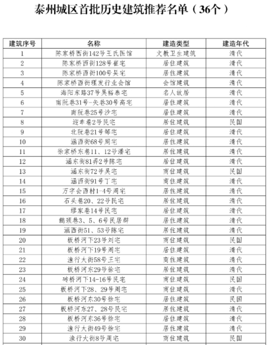 12月5日,泰州市规划局公示了泰州城区首批历史建筑推荐名单,共有36处居住建筑、商业建筑、名人故居、构造物入选,建筑年代涵盖明代、清代和民国时期。