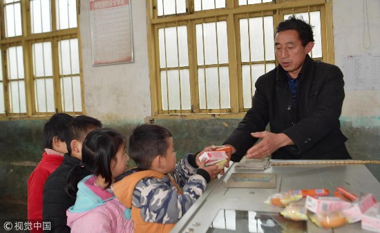 2018年12月4日,湖北恩施,周美成老师在朝南教学点为学生发放营养午餐。杨顺丕 摄