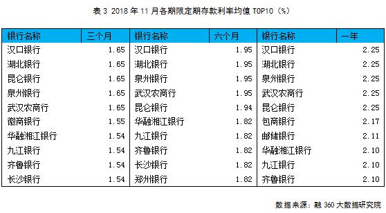 中新经纬客户端12月8日电 7日晚间,融360发布的11月银行存款利率报告显示,11月份银行各期限存款利率仍是短降长升的趋势,5年定期存款利率上涨最多,3年和5年定期存款利率均创年内最高;各期限定期存款利率排名第一的银行依然为汉口银行和泉州银行。此外,随着年末银行揽储大战即将开始,12月普通定期存款利率预计还会略有上调。