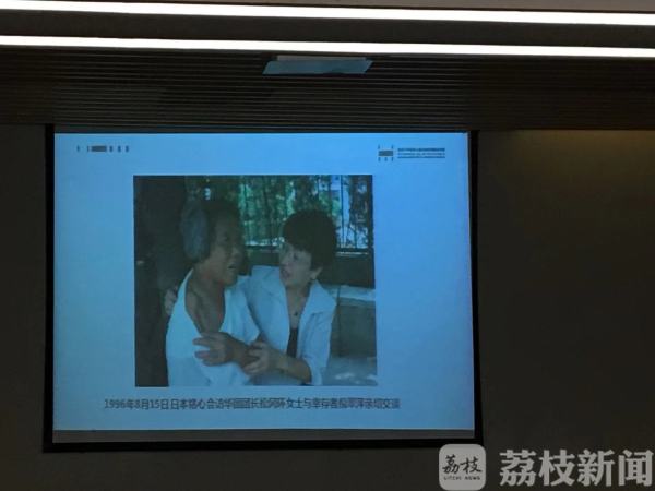 “这是1996年8月15日本铭心会访华团团长松冈环女士与幸存者倪翠萍亲切交谈的画面。”