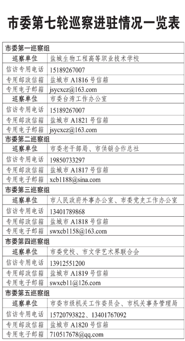 近日,根据市委统一部署,市委5个常规巡察组和1个专项巡察组已全部进驻被巡察单位开展巡察工作。其中,5个市委巡察组分别进驻市委台湾工作办公室、盐城生物工程高等职业技术学校、市委老干部局、市供销合作总社、市人民政府外事办公室、市委党史工作办公室、市委党校、市文学艺术界联合会、市委市级机关工作委员会、市机关事务管理局,对这10个单位党组织开展为期40天的常规巡察。1个市委专项巡察组对射阳县洋马镇、阜宁县东沟镇、滨海县通榆镇、盐城经济技术开发区步凤镇党委,以及在射阳、阜宁、滨海3县分别抽取的1个其他乡镇党委进行巡察“回头看”,每个乡镇为期2至3天。