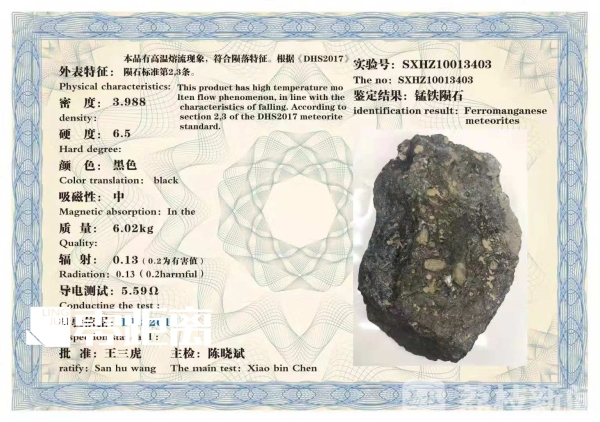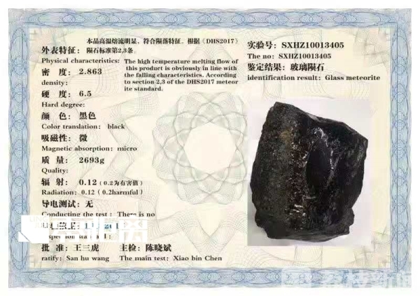 这些石头到底是不是陨石呢?孙先生在网上找到了一家山西的鉴定机构,经过鉴定,对方明确表示,孙先生送检的两块石头就是陨石,而且还给孙先生发来了鉴定证书,鉴定结果为,一块是锰铁陨石,一块是玻璃陨石。孙先生说,送检费花了300块钱,证书费花了600块钱,一共花了900块钱,这家鉴定机构说东西是真的,才能出证书,如果不是真的,钱再多,也不担这个责任,不是钱的事。