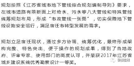 近年来城市建设发展迅速,由于缺乏管线综合规划指导,“拉链马路”、城市积水等现象频出,为保障城市安全,宿迁编制了《宿迁市中心城区地下管线综合规划(2016-2030)》。