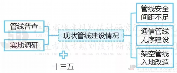 基于宿迁市管线普查及实地调研,评估现状管线建设情况,对管线安全间距不足、通信管线无序建设、架空线入地改造等问题,结合各专业十三五规划,提出近期方案,并预留远期管位。
