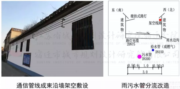 对东大街、项里景区等历史街巷,线路成束穿管敷设于外墙,同时对雨污水管线进行分流制改造。