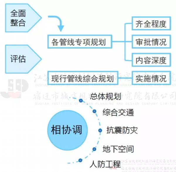 全面整合各管线专项规划,对其齐全程度、审批情况、内容深度以及现行管线综合规划实施情况进行评估。同时与城市总体规划、综合交通等规划相协调。