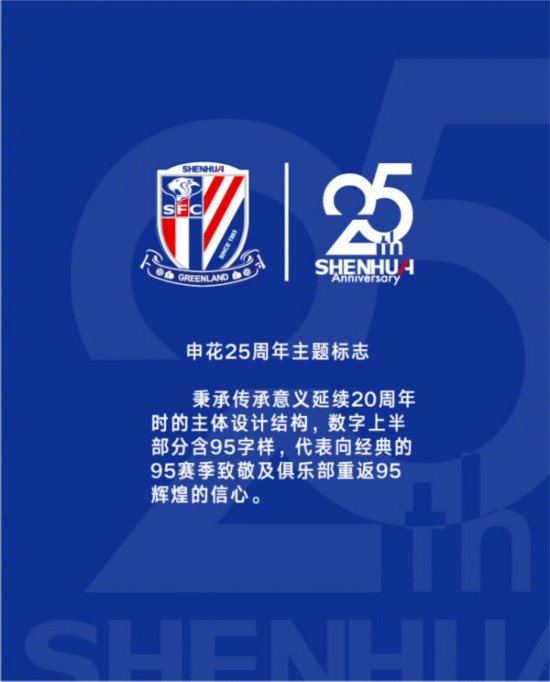 腾讯体育12月10讯,今天是上海申花25周年纪念日,申花官方连发4图纪念生日,并发布了25周年主题标志。并阐述标志意义:秉承传承意义20周年时的主体设计结构,数字上半部分含95字样,代表向经典赛季致敬及俱乐部重返95辉煌的信心。