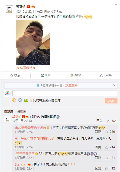 “眼睛被打成熊猫了,一定程度影响了我的颜值,不开心。”郭艾伦在个人社交平台上写道,表示自己背打成了“熊猫眼”,同时他还上传了一张自拍照,不过或许是因为光线等因素,郭艾伦所说的“熊猫眼”看起来并不太明显。