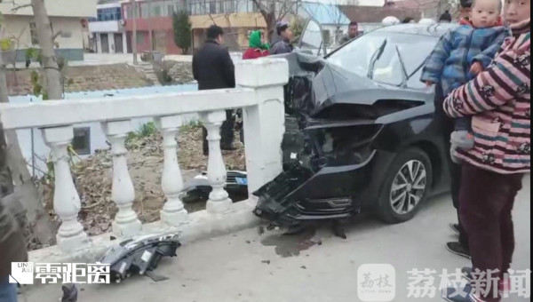 记者赶到现场时,已有不少附近村民在现场围观,一辆黑色轿车头朝南与桥栏杆抱在一起,车子的车头部位因与栏杆发生剧烈撞击,呈U型与栏杆抱在一起,车前保险杠断裂,引擎盖隆起变形,零部件散落一地,驾驶室内的两只安全气囊全部打开。