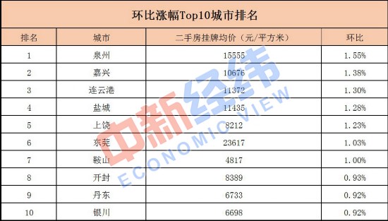 此外,泉州(1.55%)、嘉兴(1.38%)、连云港(1.30%)、盐城(1.28%)、上饶(1.23%)、东莞(1.03%)、鞍山(1.00%)、开封(0.93%)、丹东(0.92%)和银川(0.92%)等十城为二手房均价涨幅榜前十。