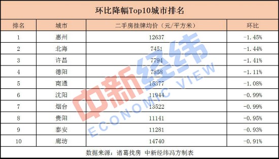 中新经纬客户端梳理发现,惠州(-1.45%)、北海(-1.44%)、许昌(-1.41%)、德阳(-1.11%)、南通(-1.08%)、沈阳(-0.99%)、烟台(-0.99%)、贵阳(-0.95%)、泰安(-0.93%)和廊坊(-0.91%)等十个城市二手房均价环比跌幅最大。
