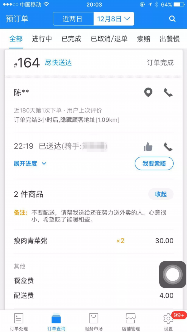 “不要配送,请帮我送给还在努力送外卖的人。心意很小,希望吃了能暖和些。”已是晚上11点,快打烊的文三西路曼玲粥店,老板娘接到这样一个特别的外卖订单,点了两份瘦肉青菜粥。