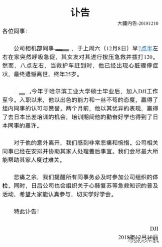 近日,深圳一则标注为“大疆内告”的讣闻在网络上传播。据讣告显示,大疆相机部一员工于上周六(12月8日)早7点半左右在家中突然呼吸急促,其女友对其进行了按压急救并拨打了120。然而,八点左右,当救护车赶到时,他已经出现心脏骤停症状,并最终离世,终年25岁。
