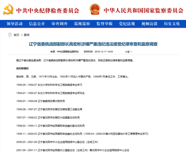 据辽宁省纪委监委消息:辽宁省委统战部副部长高宏彬涉嫌严重违纪违法,目前正接受纪律审查和监察调查。