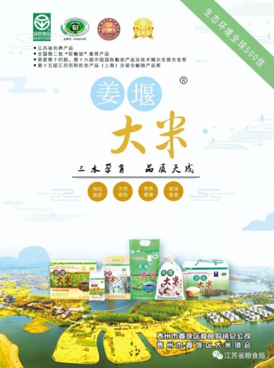 “姜堰大米”集体商标2011年经国家工商总局批准注册。近年来,姜堰区粮食局高度重视“姜堰大米”品牌建设,坚持“天然、绿色、健康”的产品理念,全力打造姜堰大米全产业链。2015年“姜堰大米”通过国家绿色食品A级产品标志认证,先后获得“江苏好大米”金奖、江苏省名牌产品、“苏米”十大区域品牌之一等荣誉,入选江苏省和全国名特优新农产品名录。