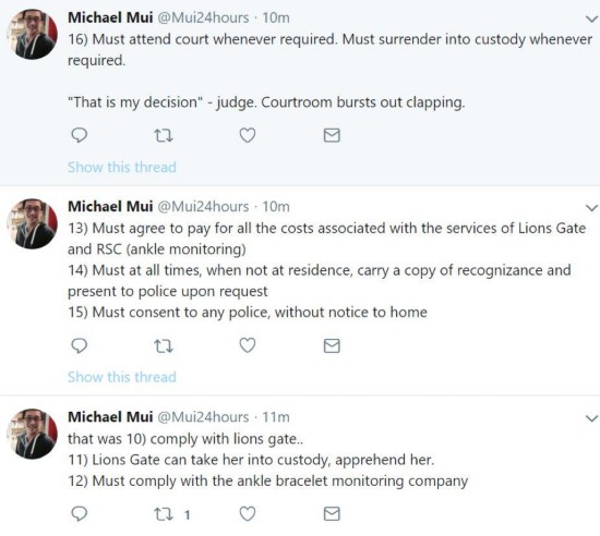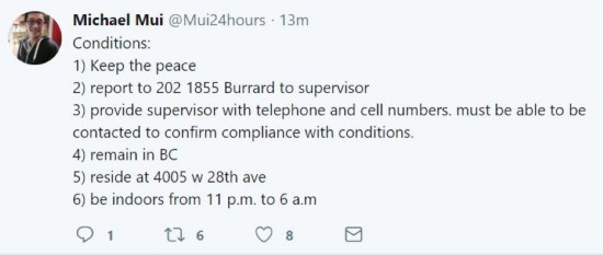 根据加拿大媒体的报道,这16项保释条件中最核心的内容是:她将不得离开加拿大,只能在温哥华市以及周边很小一部分临近市区活动,且必须定期向官方汇报自己的行踪,必须上交自己的护照,每天晚上11点到次日早上6点必须回到住所不得外出。