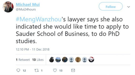 而且根据孟女士律师的透露,她本人也已经想好了该如何打发这段时光——去位于温哥华市内的不列颠哥伦比亚大学的“尚德商学院”攻读博士学位。