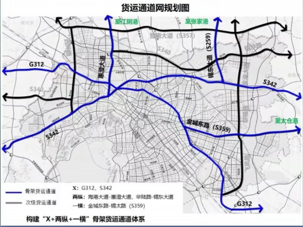 具体为:改线后G312和S342形成中心城“X货运保护半环”;惠澄大道(S229)、锡东大道(S259)为“两纵”,分别对接江阴港和张家港;金城东路(S359)为“一横”,对接太仓港。