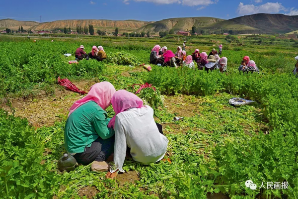 宁夏固原市,一片芹菜田里,劳作间隙,收菜的妇女们在休息。 摄影 邬志斌