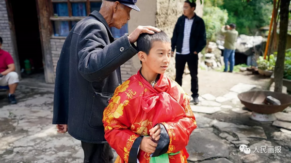 甘肃陇南市武都区鱼龙镇是武都高山戏的发源地。12岁的杨建鹏,是鱼龙中心小学五年级学生。他酷爱高山戏,老人看了杨建鹏 的表演,摸着他的头说,“这娃绝对是头人的苗子。” 摄影 李舸