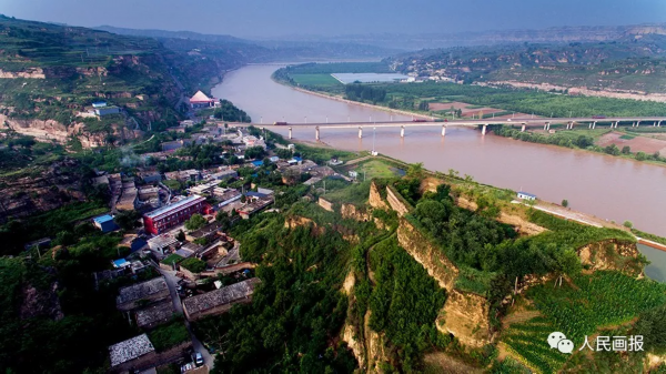 俯瞰山西兴县高家村镇黑峪口村。黄河兴神大桥从这里连接陕西神木。黑峪口村历史悠久,目前计划大力发展文化旅游产业。 摄影 海洋