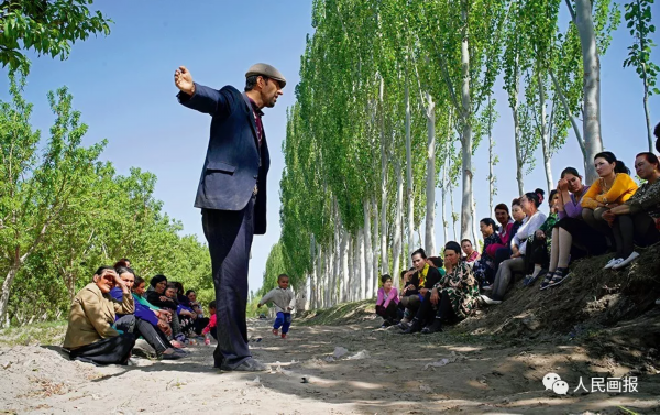 新疆喀什地区莎车县孜热甫夏提村,村干部库杜斯·托胡提正在给村民开会。 摄影 陈杰