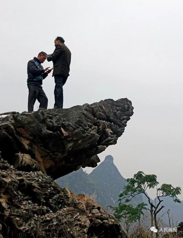 广西百色市田东县梅林村民在周边山口寻找网络信号,他们期望了解外面的世界,尽早脱贫致富。 摄影 傅拥军