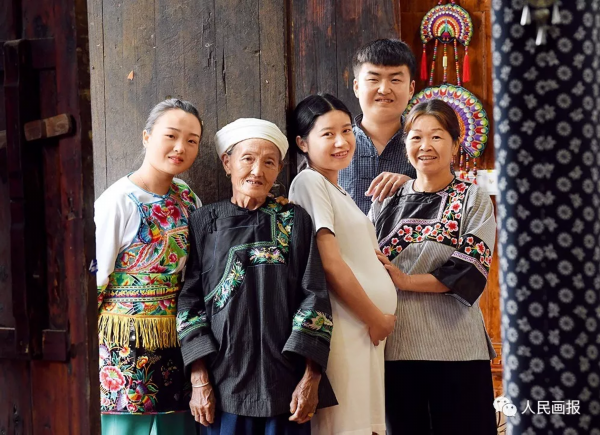 湖南湘西土家族苗族自治州十八洞村回乡创业的施俊(右二)和母亲、妻子、二姐、祖母在家门口合影。施家原本有六口人在外打工。村里旅游火了,他们返回家乡创业。目前村里实现了互联网全覆盖,施俊和妻子打算利用网络平台做微商,将山里的土特产卖到全国各地。 摄影 居杨