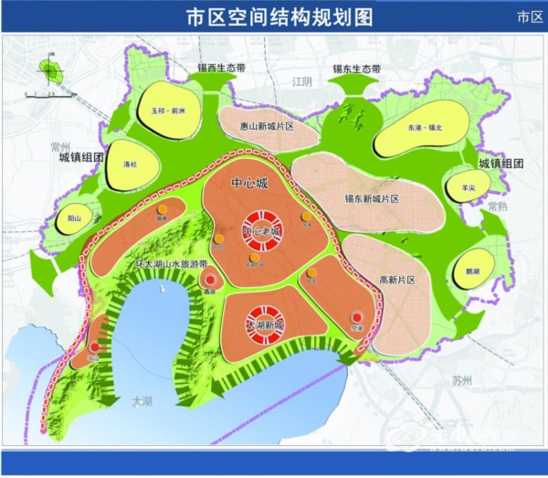 优化市域空间格局,提升发展“凝聚力”。按照新一轮总规构建的市域空间格局,通过太湖长江发展轴、沿湖生态发展环,串联锡澄、锡宜两个协同发展区,强化市域一体发展。