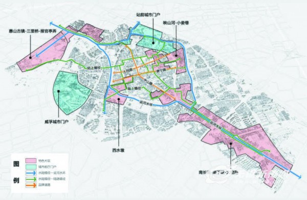(历史城区“双修”重点空间示意图一组水陆锡径,两个城市客厅三条品牌道路,四个特色片区)