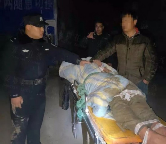120医护人员到场后,民警协助将该男子用担架抬上救护车,送往医院。