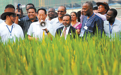 2009年9月,袁隆平带各国朋友参观试验田。新华社发