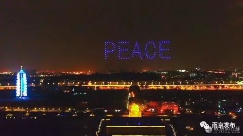 当无人机编队缓缓停留在长干桥上空,“PEACE”(和平)在静静流淌上千年的秦淮河前定格,和平之夜的祝福——山河壮美,天长地久;人民幸福,世界和平。