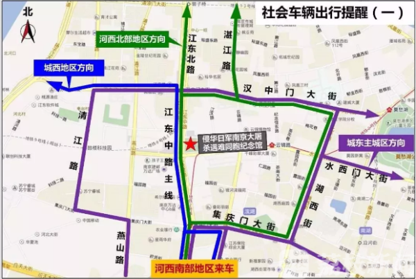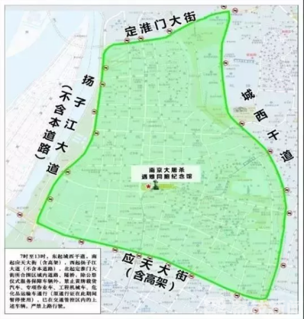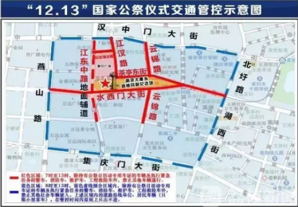 公祭日当天周边区域从早上8点开始管控。12月13日8时至13时,东起北圩路(汉中门大街至水西门大街段)、湖西街(水西门大街至集庆门大街段);南起集庆门大街(湖西街至燕山路段);西起燕山路(汉中门大街至集庆门大街段);北起汉中门大街(燕山路至北圩路段)所合围区域内(以上路段均不含本道路);除持有公祭仪式专用车证的车辆及执行紧急任务的警车、消防车、救护车、工程救险车外,禁止其他社会车辆驶入。