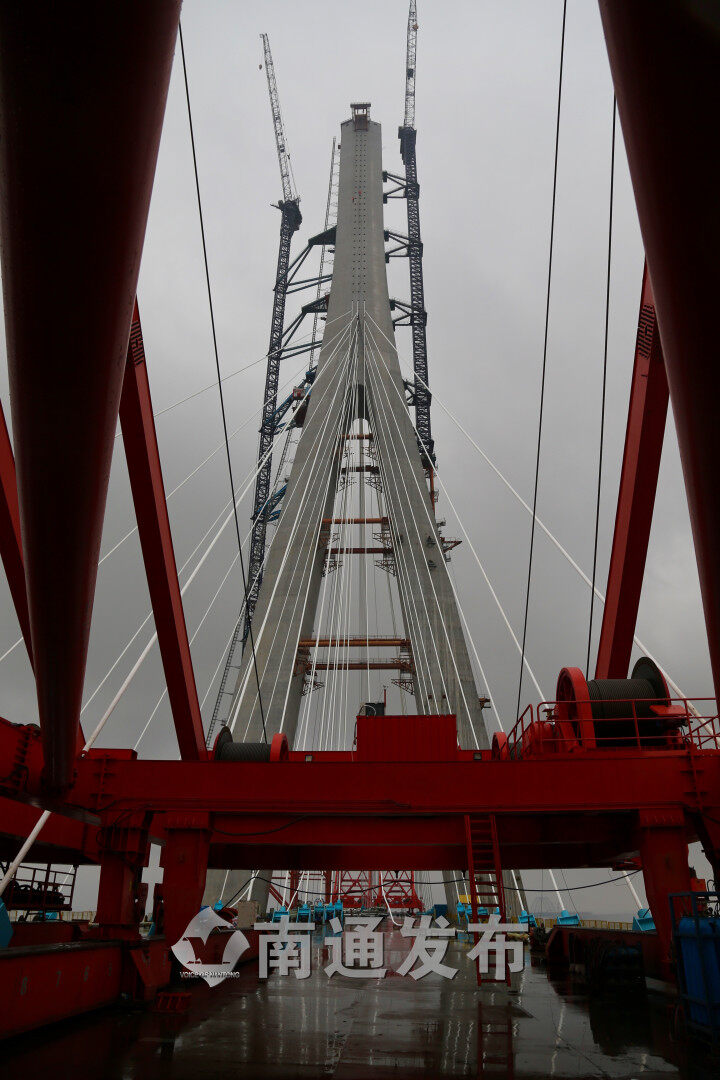 2018年是沪通长江大桥建设的关键一年,主塔施工、钢梁架设、钢缆挂设等三个重要工序的施工均进入关键节点,一批涉桥新结构、新材料、新装备、新工艺集中亮相。其中,大桥的北主塔——28号主塔墩在国庆前夕封顶,将高度定格于330米,成为世界最高的斜拉桥主塔墩;大桥的南主塔——29号主塔墩已经于上月突破200米,正在进行合龙段的钢筋绑扎,有望在年内实现中塔柱合龙。两座主塔均已开始架梁,这些钢梁采用新型的箱桁组合结构,北主塔的钢梁已经达到378米,其长度超越了主塔的高度。用于架梁的4台1800吨架梁吊机中,北塔的两台架梁吊机已经就位,并已进入大节段架梁的常态化作业;南塔的两台吊机已经完成安装与调试,即将发往桥址。