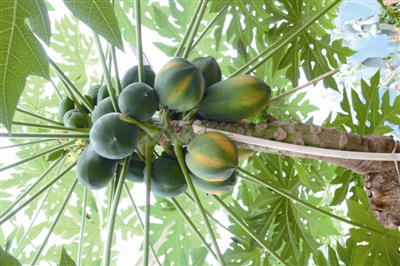 在龚进才的带领下,记者看到,一个个紫红色的火龙果挂在三角状的枝头上,如一朵朵含苞欲放的莲花,又像是熊熊燃烧的火球;几十只大大小小的木瓜,由下而上顺次排开,像簇拥在一起抱团取暖的小伙伴;一小丛紫皮甘蔗头顶着绿油油的叶片,像美女展现着她们纤细的身腰。再抬头看看头顶上的猕猴桃、百香果、水果番茄,则像一个个褐色、绿色、红色的小灯笼一样从藤蔓上挂了下来,着实喜人。
