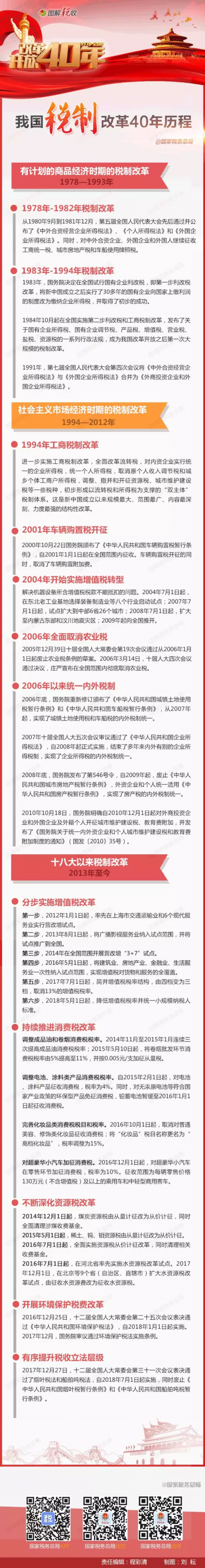 改革开放的40年,是我国经济飞速发展,社会不断进步,人民生活水平显著提高的40年,同时也是我国税制不断改革发展完善的40年。一张图为你梳理我国税制改革40年历程。