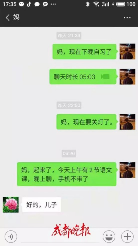 可是当赵先生看到置顶聊天窗口,发现里面的对话口吻完全是个高中生:“妈现在下晚自习了”、“妈,今天上午有2节语文课,晚上聊,手机不带了”,这让赵先生百思不得其解。直到他将手机归还到王强所在的公司时,这个误会才解开。