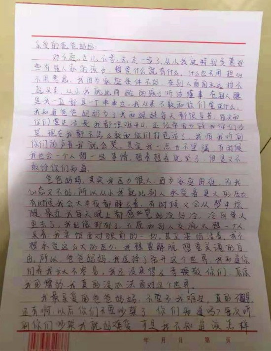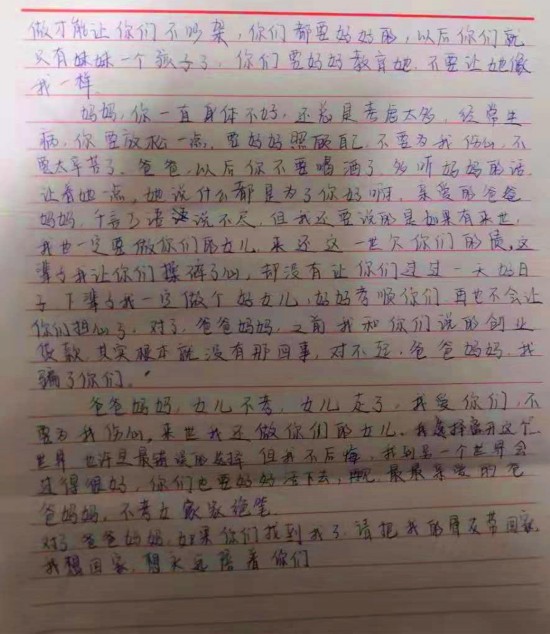 对不起,女儿不孝,先走一步了,从小我就特别羡慕那些有钱人家的孩子,想要什么就有什么,什么也不用担心不用考虑,我因为家庭条件不好,在别人面前永远抬不起头来 ,从小我就比同龄的孩子听话、懂事,在别人眼里我一直都是一个乖乖女。我从来不敢和你们要求什么,我知道爸爸妈妈为了我和妹妹,每天都很辛苦。每次和你们要生活费我都很难开口。还经常因为钱和你们吵架,现在我都不怎么敢和你们打电话了,我怕我听到你们的声音我就会哭。其实我一点也不坚强,有时候我也会一个人想一些事情,想着想着就哭了,但是又不想给你们知道。